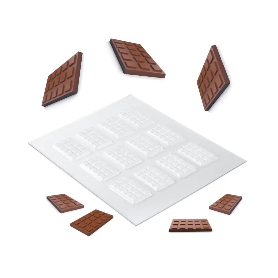 Molde profesional reutilizable para chocolate con 12 cavidades en forma de mini barritas. Fabricado en PET termoformado para un acabado brillante y preciso.