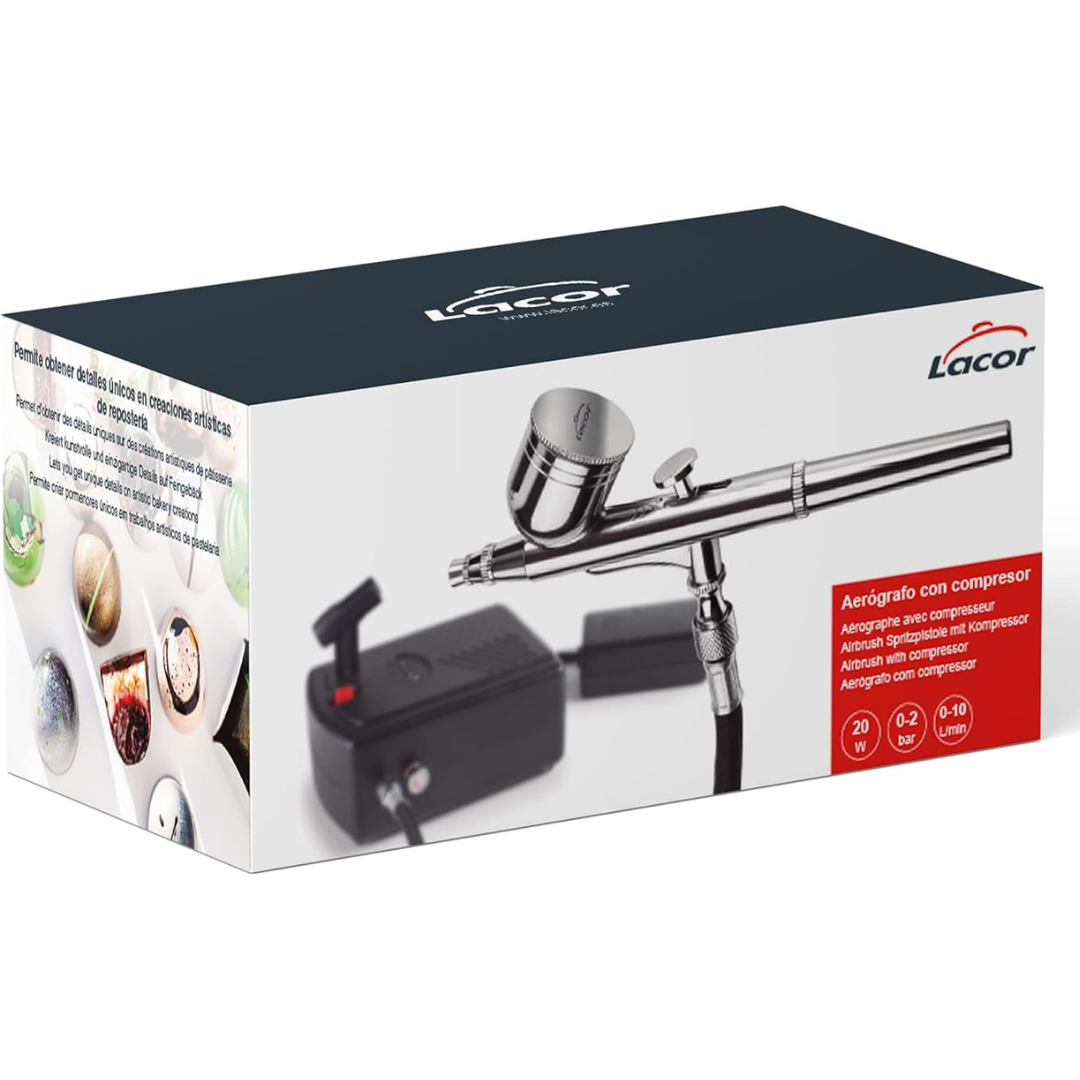 El Aerógrafo con Compresor de Lacor es una herramienta esencial para los aficionados y profesionales de la repostería que buscan llevar sus habilidades de decoración a un nivel superior con facilidad y precisión.
