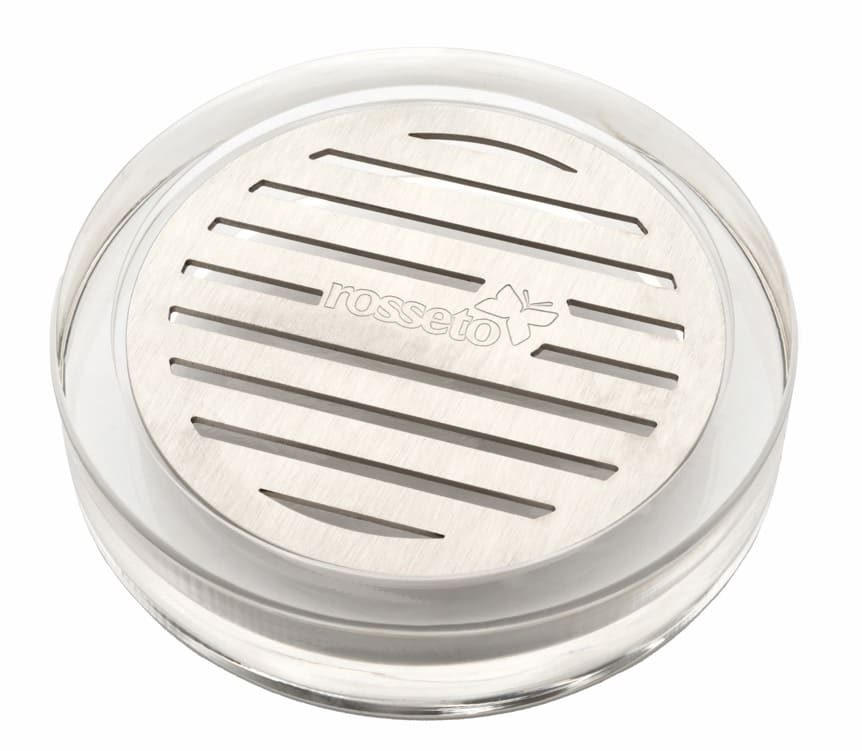 Bandeja de goteo redonda de acrílico con inserto de acero inoxidable, ideal para dispensadores de bebidas Rosseto.