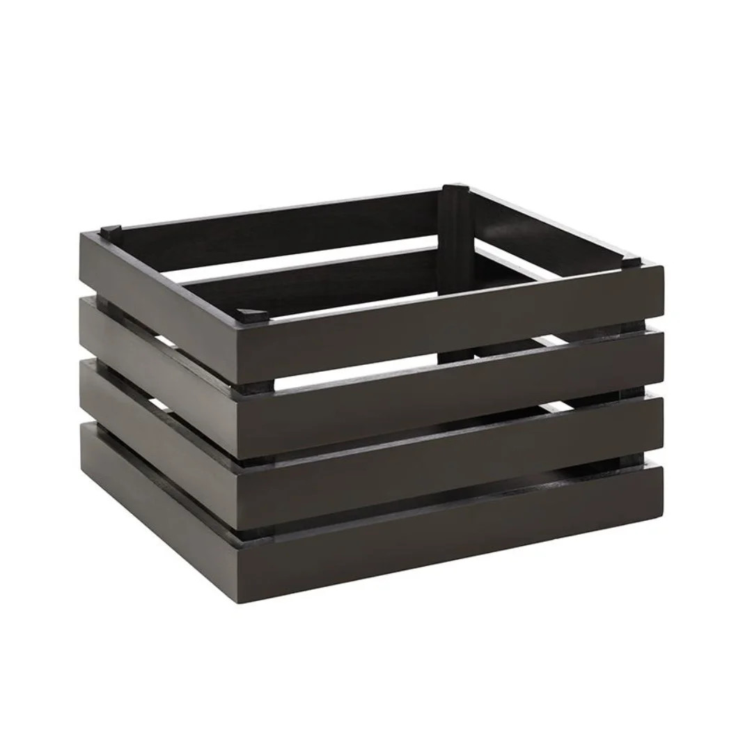 Caja buffet GN 1/2 modular en madera negra para crear alturas y composiciones en presentación profesional. Ideal para buffet desayuno en hotel, catering y autoservicio.