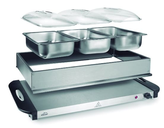 Incluye tres cubetas gastronorm GN1/3 de 2.5 L con tapas transparentes de policarbonato, y su marco de soporte de acero inoxidable garantiza estabilidad y durabilidad. El termostato regulable permite ajustar la temperatura según sus necesidades. Además, el calentador se puede utilizar como una placa de calentamiento para platos y preparados al retirar las cubetas y el soporte. Cabe destacar que no es apto para cocinar directamente sobre la placa.