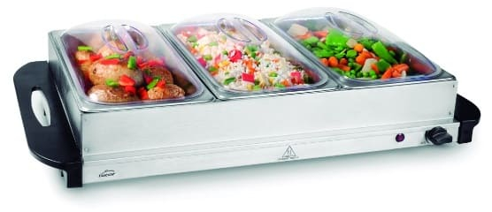 Calentador buffet Lacor con 3 cubetas GN1/3, termostato regulable y tapas de policarbonato. Superficie de calentamiento 53x35.8 cm.