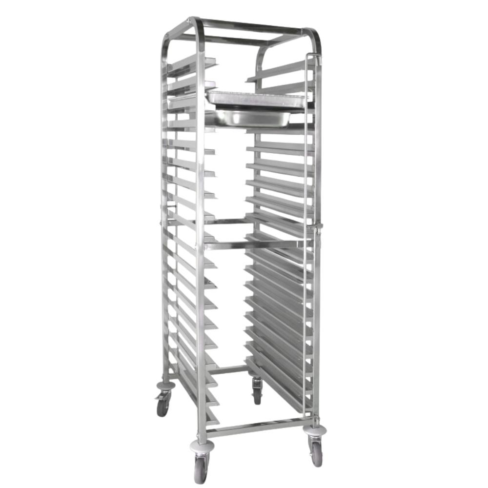 Carro bandejero GN 1/1 con 17 baldas, estructura en acero inoxidable y ruedas reforzadas. Ideal para cocinas profesionales en hostelería.