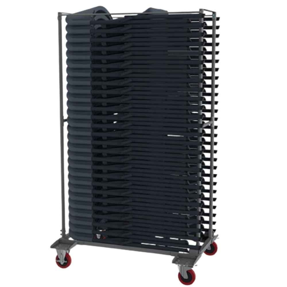 Carro de transporte y almacenamiento para sillas Norman y Brad Chair. Estructura de acero con postes verticales de sujeción y ruedas con freno.
