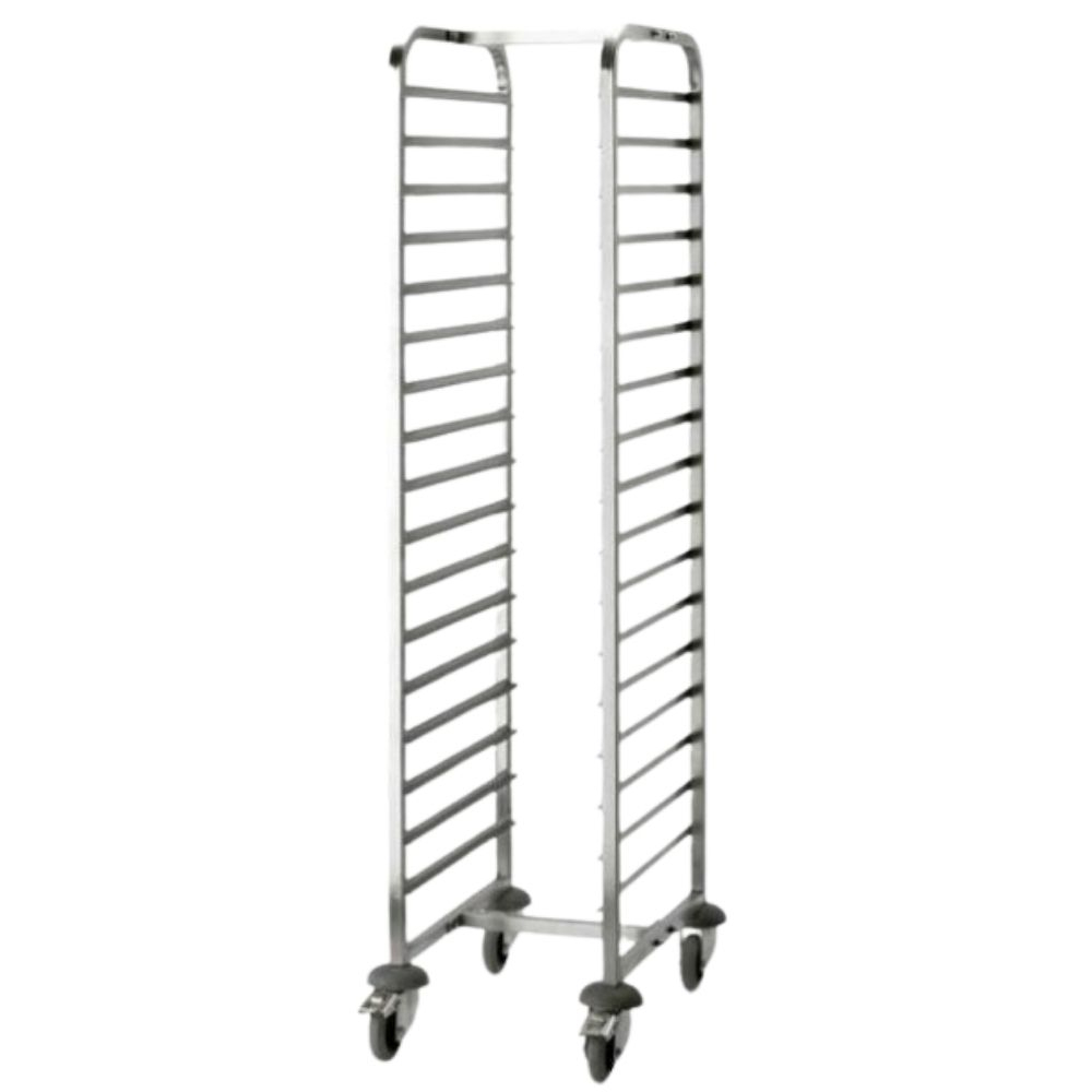 Carro porta bandejas 60x40 cm (Bakerynorm) con 20 posiciones, ruedas con freno y estructura en acero inoxidable. Ideal para panadería y hostelería profesional.