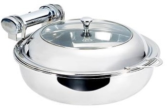 Chafing dish redondo con tapa de cristal y cubeta-inserto de acero inoxidable, ideal para mantener alimentos calientes en buffets.
