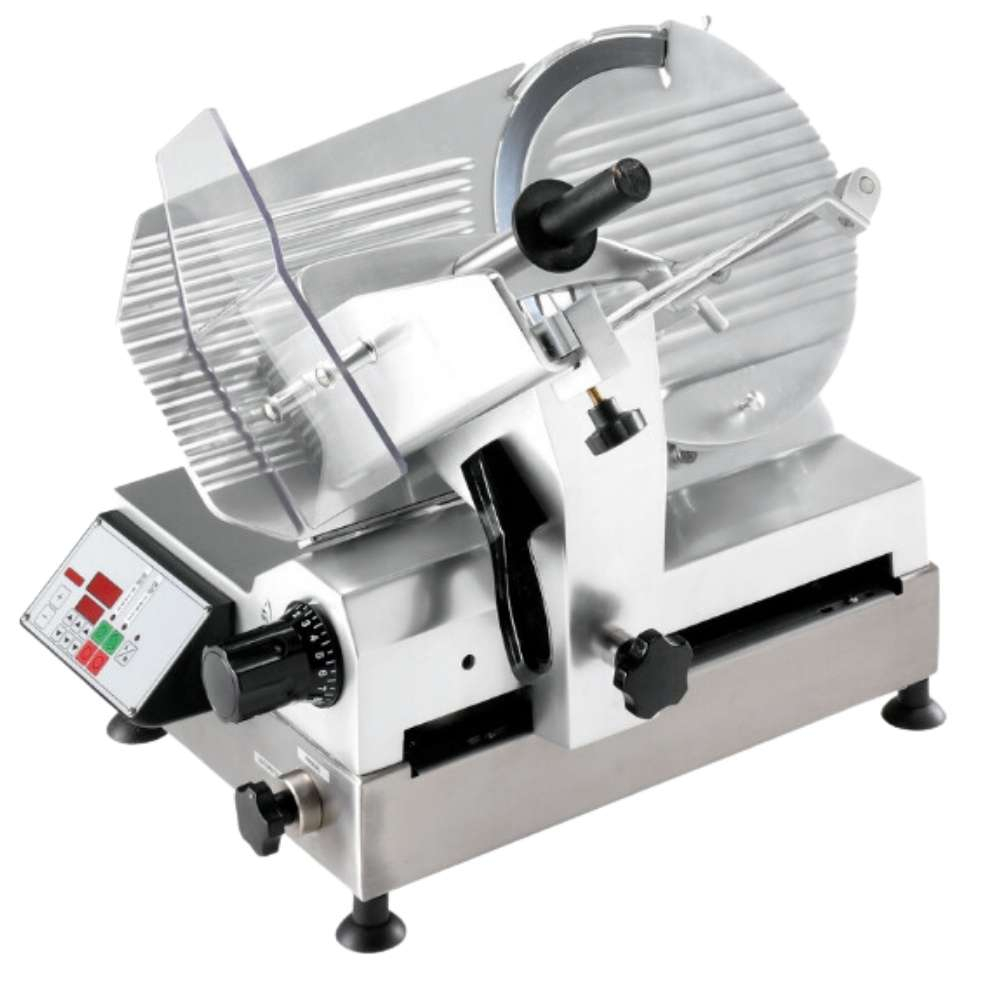 Cortadora de fiambres eléctrica Pujadas con cuchilla de 30 cm y motor de 250 W. Rendimiento continuo y alta precisión para hostelería.