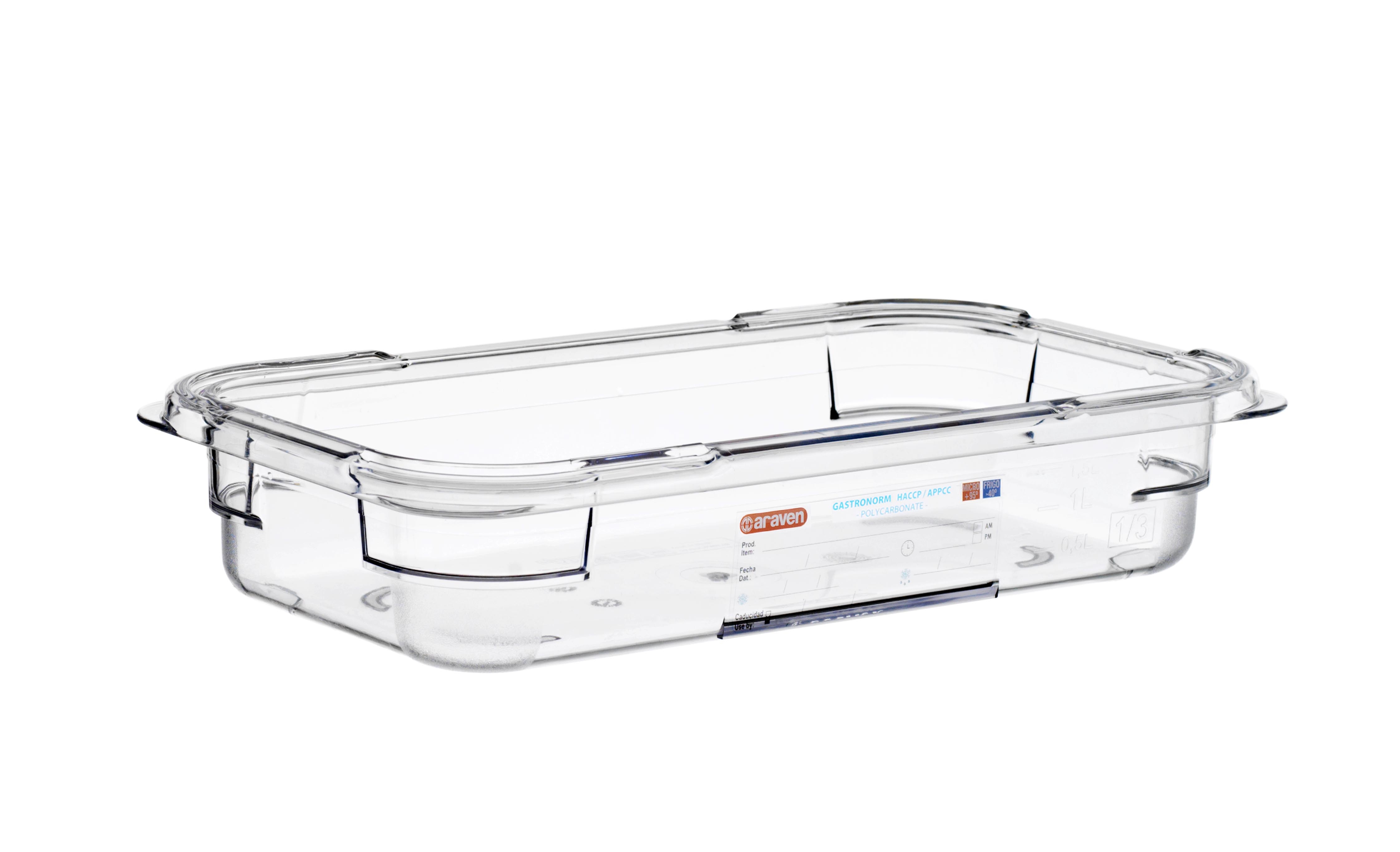 La cubeta de policarbonato GN 1/3 de Araven es una elección óptima para la manipulación y conservación eficiente de alimentos en entornos profesionales de cocina.