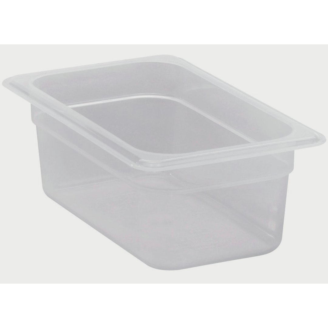 La cubeta de polipropileno GN 1/4 (162x265 mm) Altura 100 mm Cambro 44PP-190 ofrece una capacidad de 2.5 litros, garantizando eficiencia y seguridad en tus procesos culinarios.