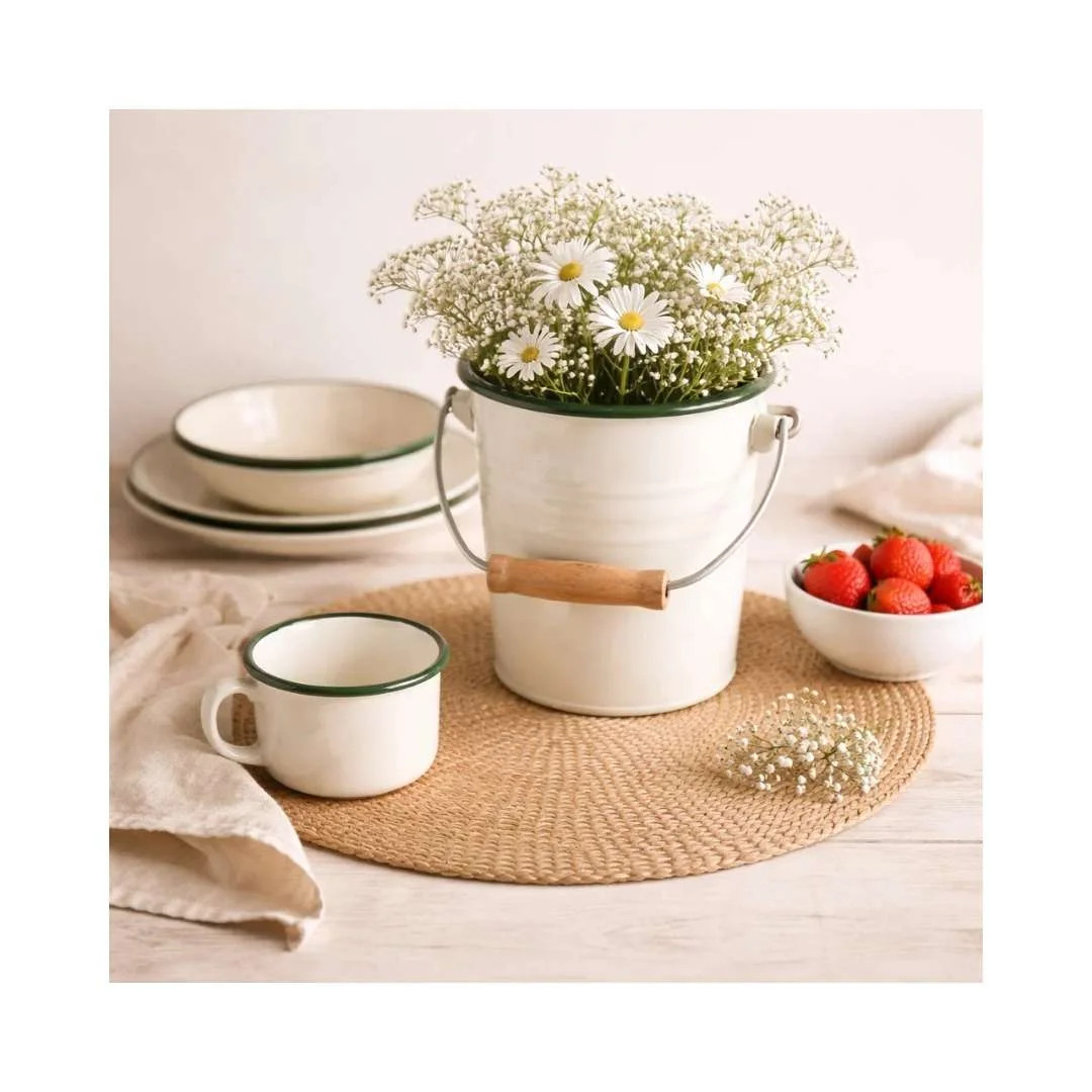 Su diseño inspirado en los tradicionales recipientes esmaltados, con acabado en tono crema y borde verde musgo, aporta una estética retro muy apreciada en conceptos gastronómicos de estilo rústico, vintage o informal.