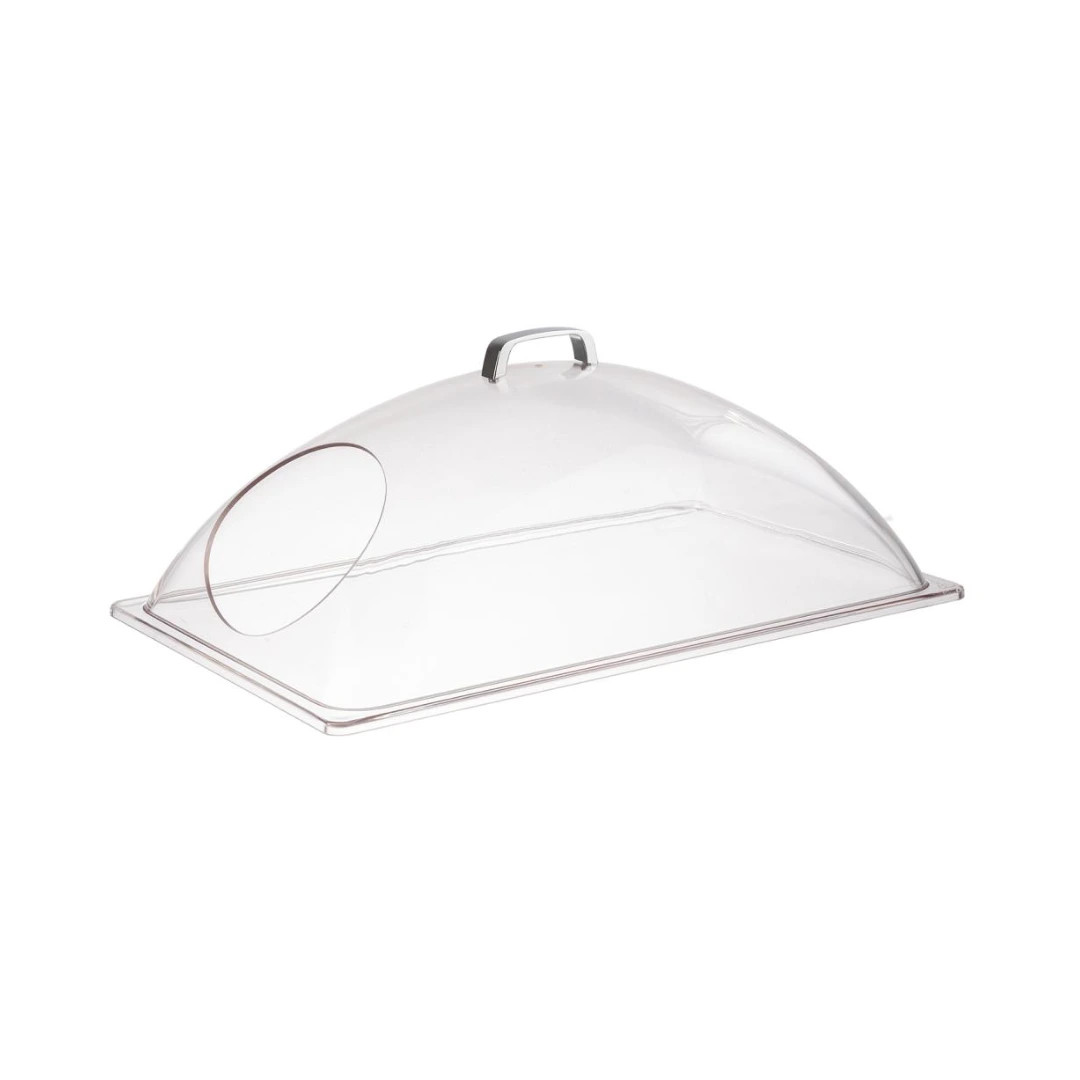 Cúpula transparente diseñada para cubrir recipientes GN 1/1 en servicios de buffet, autoservicio y presentación de alimentos. Permite proteger el contenido manteniendo la visibilidad del producto.