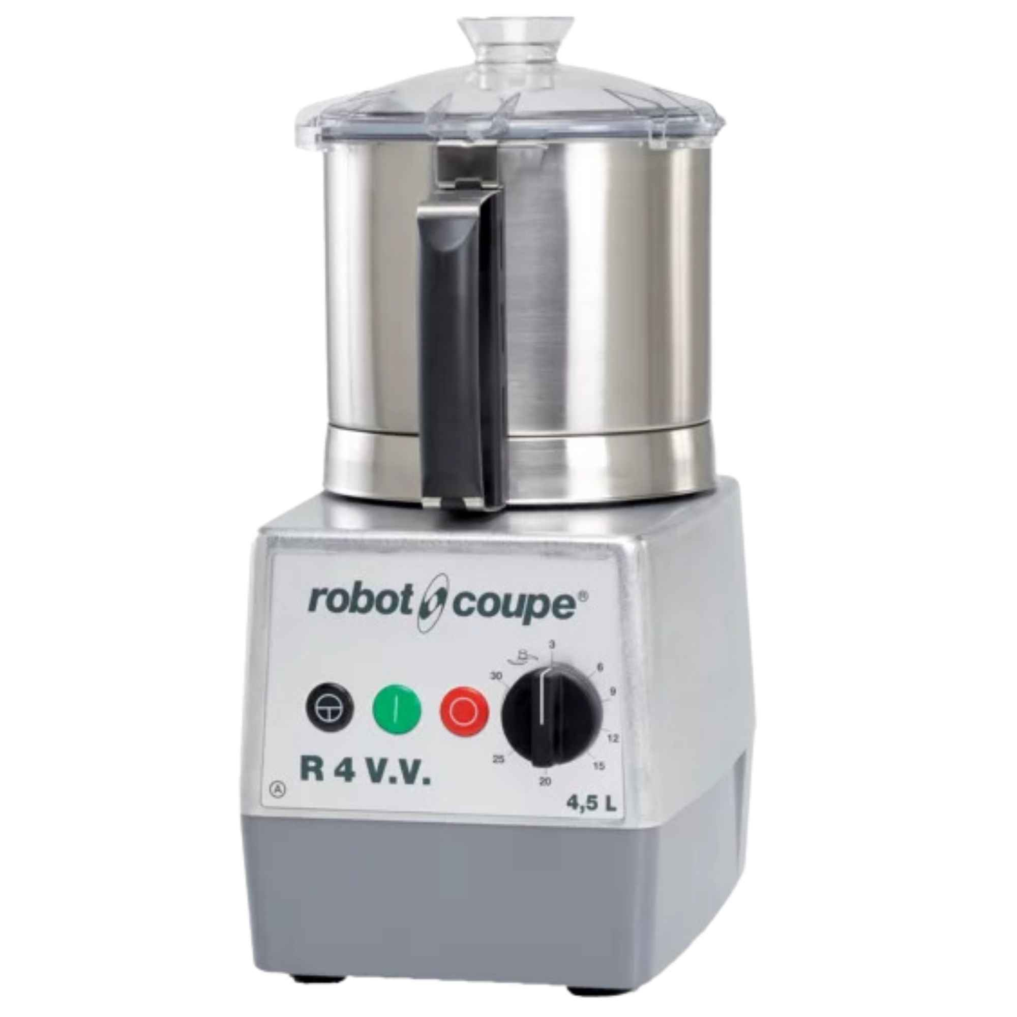 Cutter profesional de mesa Robot Coupe R4 V.V. con cuba de acero inoxidable de 4,5 L y velocidad variable, ideal para hostelería y cocinas profesionales.