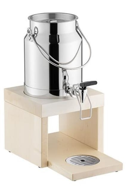 Dispensador de leche de acero inoxidable con base de madera, capacidad de 3 litros. Ideal para un servicio elegante.