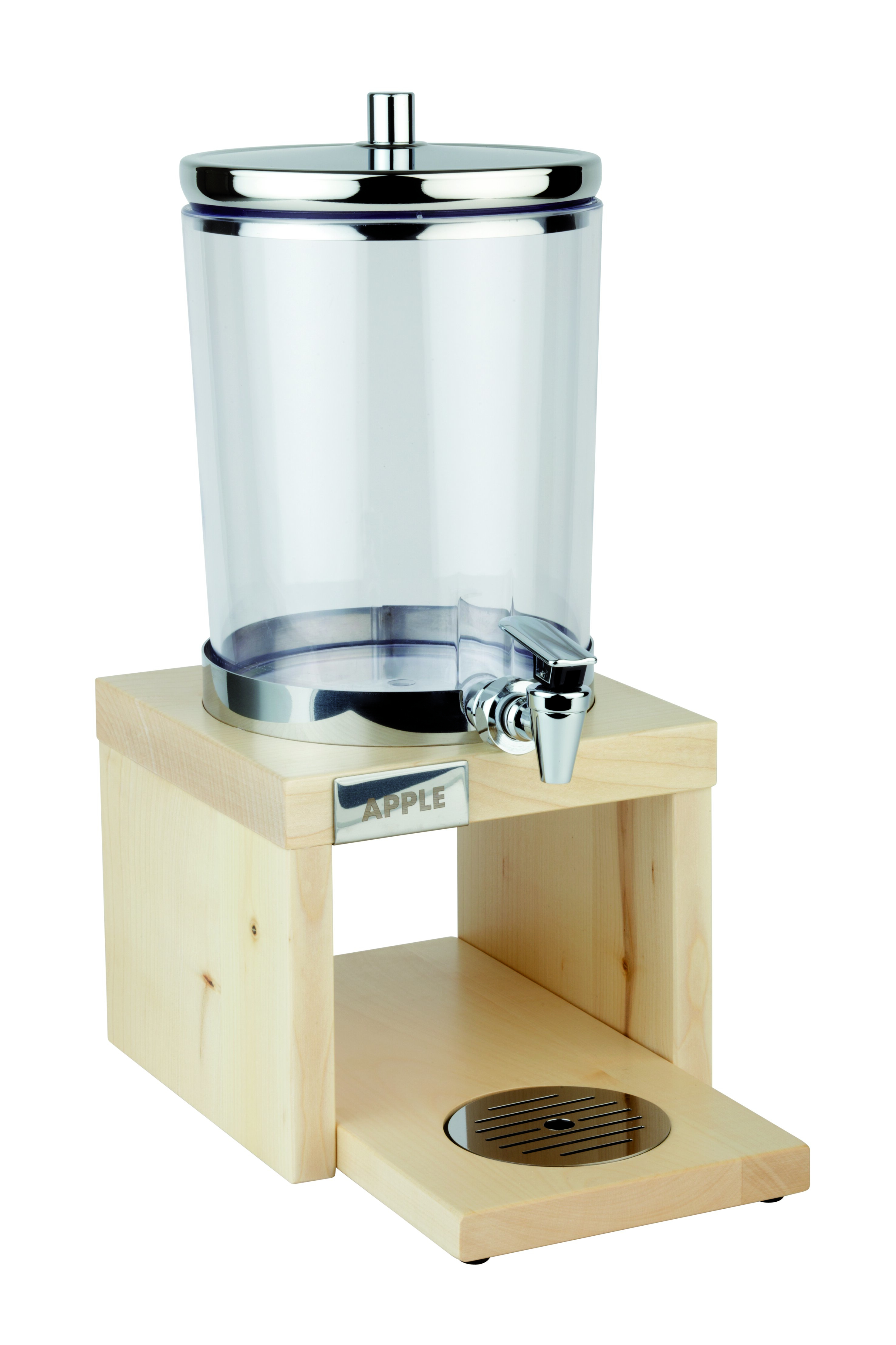 Dispensador de zumo de 4 litros con acumuladores de frío, fabricado en acero inoxidable y madera. Ideal para eventos y buffets.