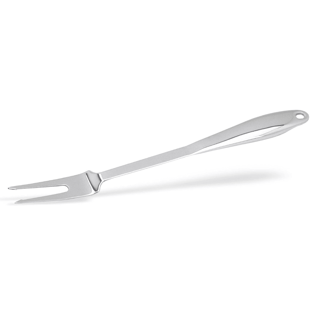 Tenedor para trinchar de acero inoxidable con acabado espejo, mango ergonómico y diseño de una sola pieza para mayor higiene. Ideal para uso profesional.