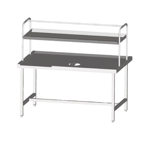 Mesa central con agujero de vaciado recubierto con goma anti-salpicaduras y porta-cestos desmontable opcional.