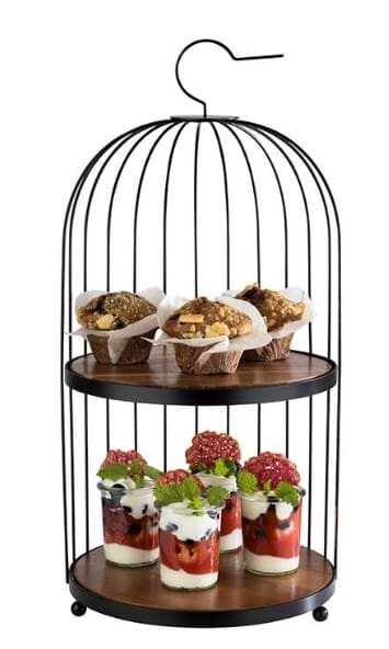 El expositor jaula soporte buffet Birdcage APS de metal negro con 2 tablas de madera de acacia, ideal para presentación elevada en buffets.