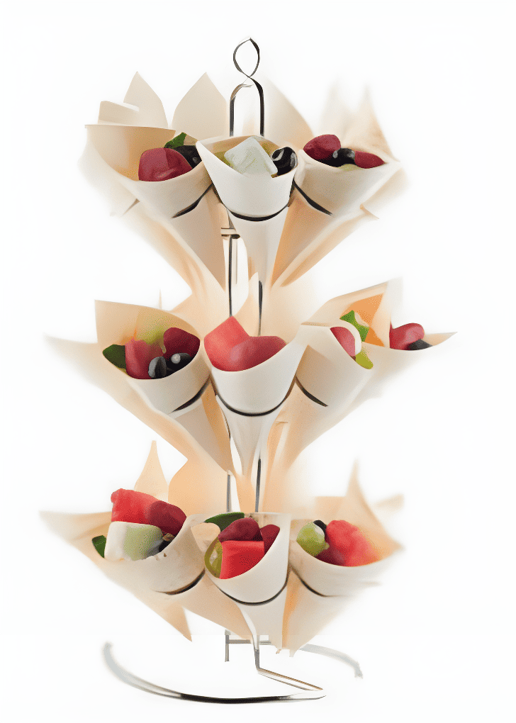 Expositor para 27 conos de helado, fabricado en metal cromado, ideal para presentaciones ordenadas y atractivas.