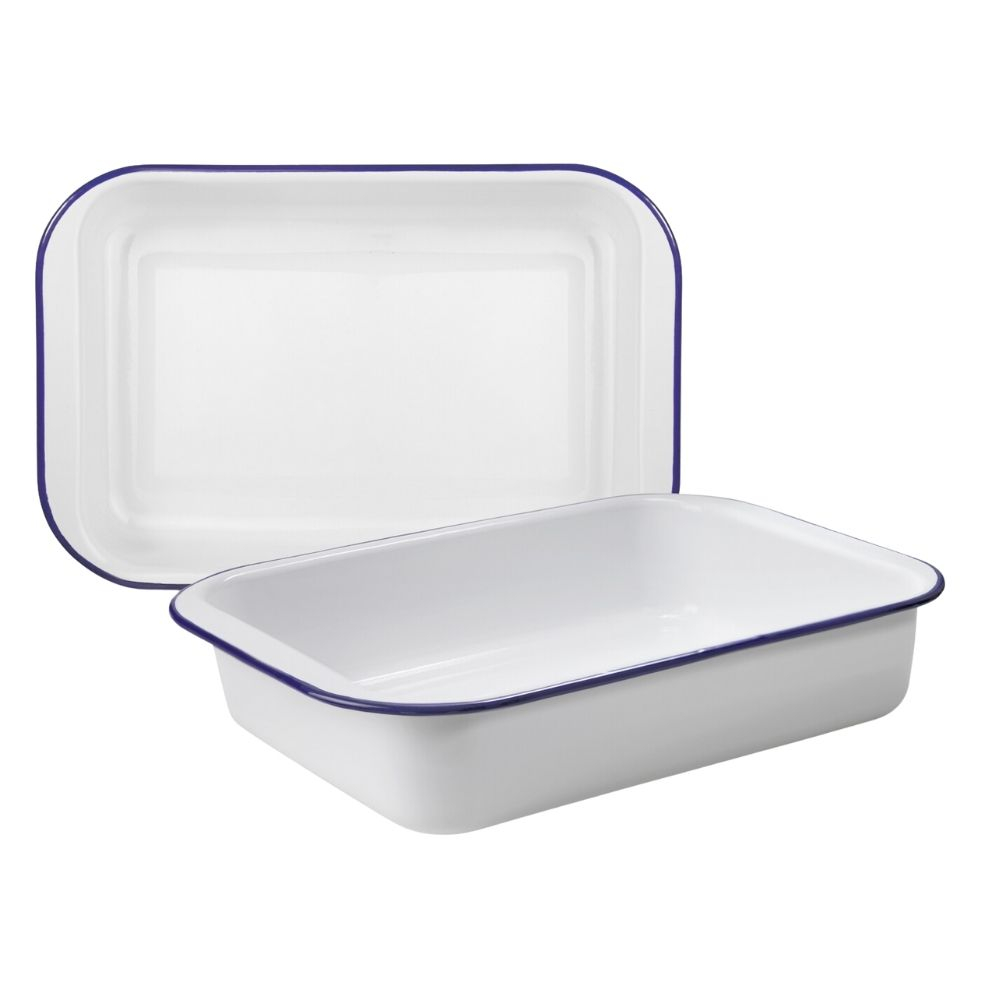 Rustidera de acero esmaltado vitrificado, color blanco con borde azul. Pack de 6 unidades, ideal para hostelería. Capacidad de 3,5 litros, resistente y apta para horno.