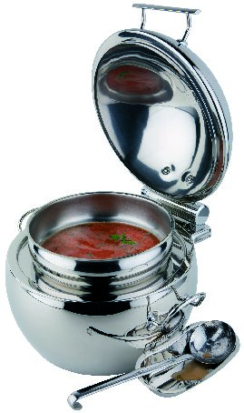 Chafing dish redondo "Globe" de acero inoxidable, 10 litros, con tapa y quemador, ideal para sopas en buffets.