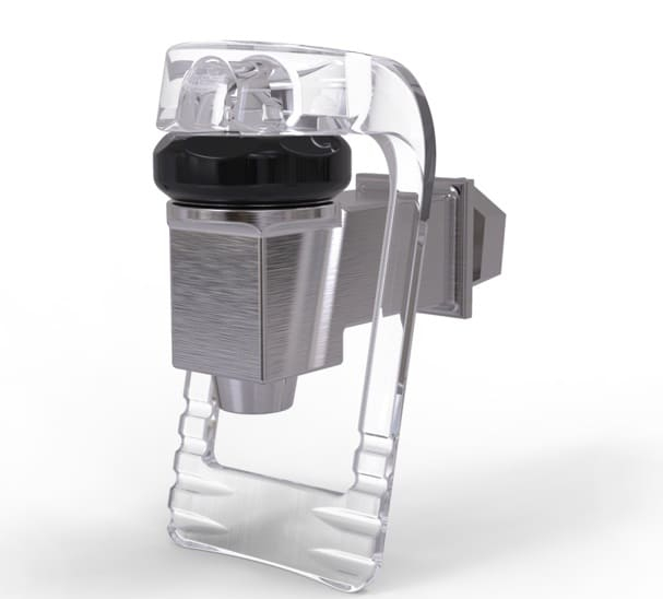 Grifo manos libres de acero inoxidable y policarbonato, compatible con dispensadores Rosseto. Ideal para dispensación higiénica.
