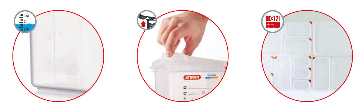Contenedor hermético de polipropileno Araven 03469, Grastronorm 2/3 (354x325 mm), 9 litros, altura 100 mm. Doble cierre para máxima protección alimentaria. Tapa flexible con etiqueta permanente y sistema ColorClip para evitar contaminaciones. Fácil apertura con tirador, apilable y encajable en vacío. Cumple con estándares higiénico-alimentarios, prolonga la vida útil de los alimentos hasta un 25%. Polipropileno resistente, apto para lavavajillas, sin BPA.