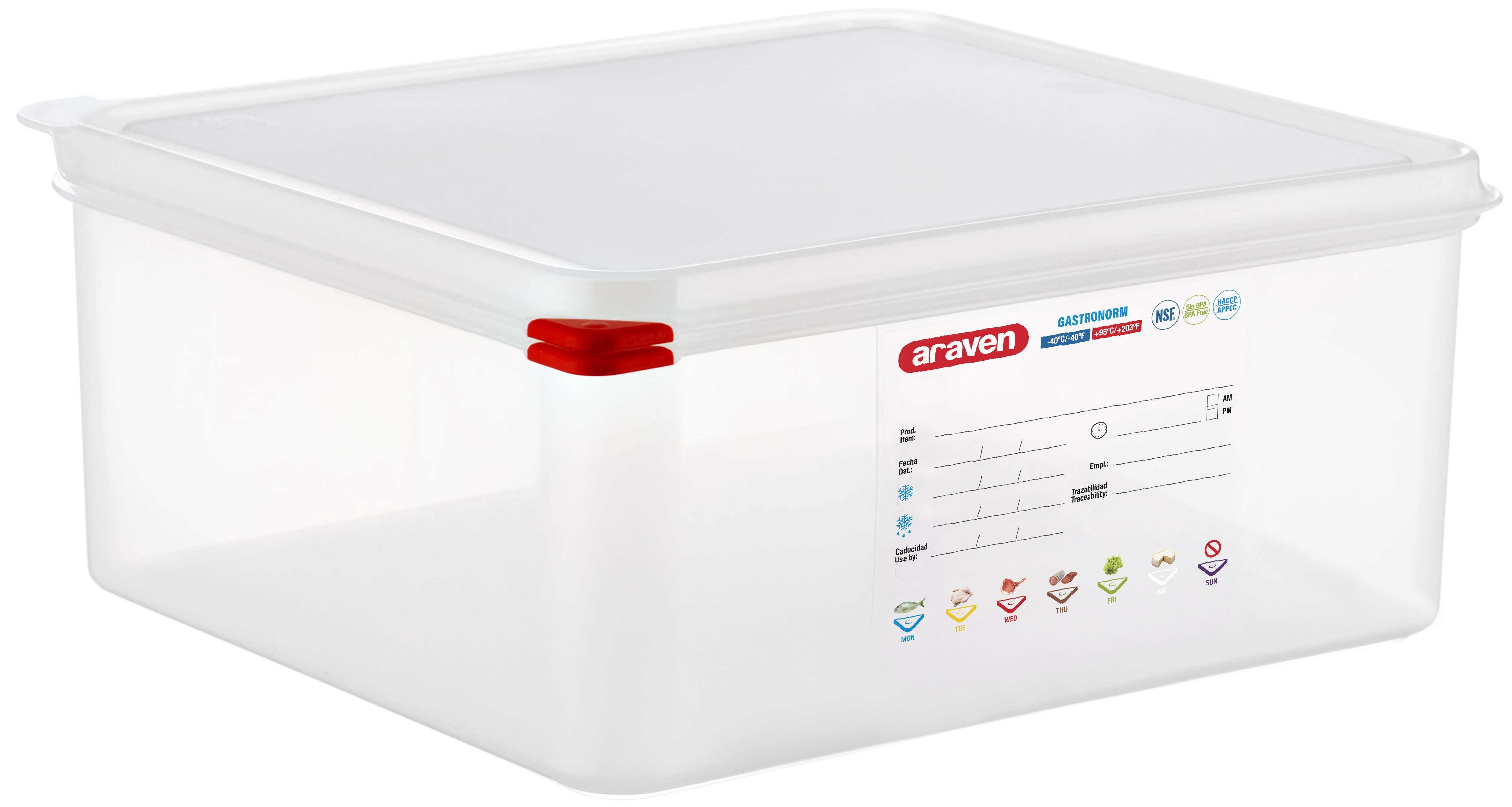 Contenedor hermético de polipropileno Araven 00470, Grastronorm 2/3 (354x325 mm), 14 litros, altura 150 mm. Doble cierre para máxima protección alimentaria. Tapa flexible con etiqueta permanente y sistema ColorClip para evitar contaminaciones. Fácil apertura con tirador, apilable y encajable en vacío. Cumple con estándares higiénico-alimentarios, prolonga la vida útil de los alimentos hasta un 25%. Polipropileno resistente, apto para lavavajillas, sin BPA.