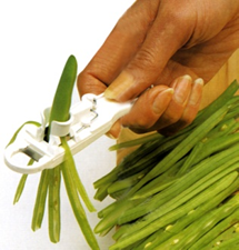 Troceador en juliana de judías verdes en 3 sencillos pasos. En primer lugar, el troceador incorpora una cuchilla para cortar las puntas de la judía. En segundo lugar, inserta la judía por el orificio empujando firmemente en línea directa hacia abajo. Finalmente, por la parte inferior estira la judía perfectamente troceada.