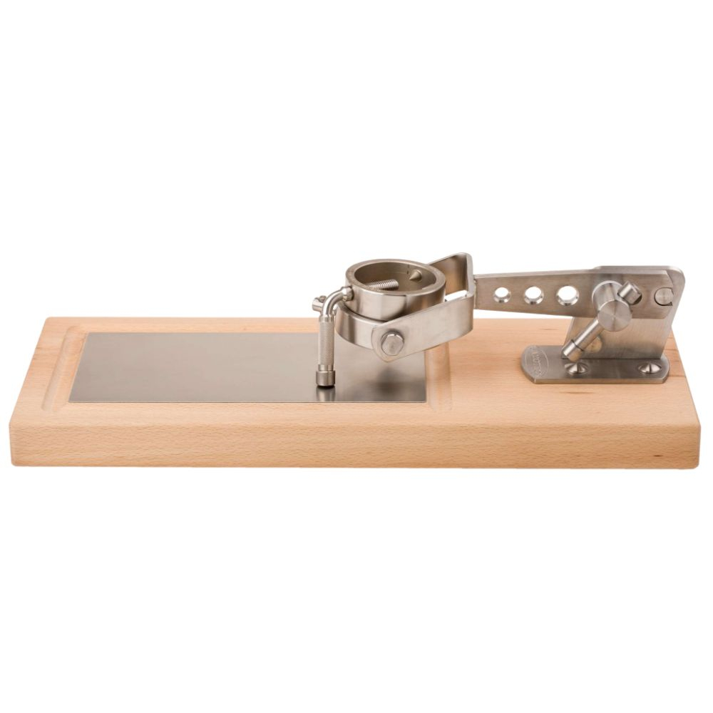 Gracias a su estructura de acero inoxidable macizo y la base de madera de haya, garantiza firmeza durante el corte del jamón.