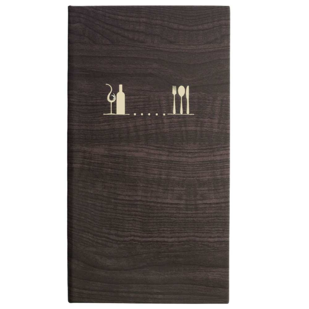Porta Menú René estrecho vertical, ideal para carta de vinos. Símil piel madera negra, 4 fundas fijas y personalizable para hostelería profesional.