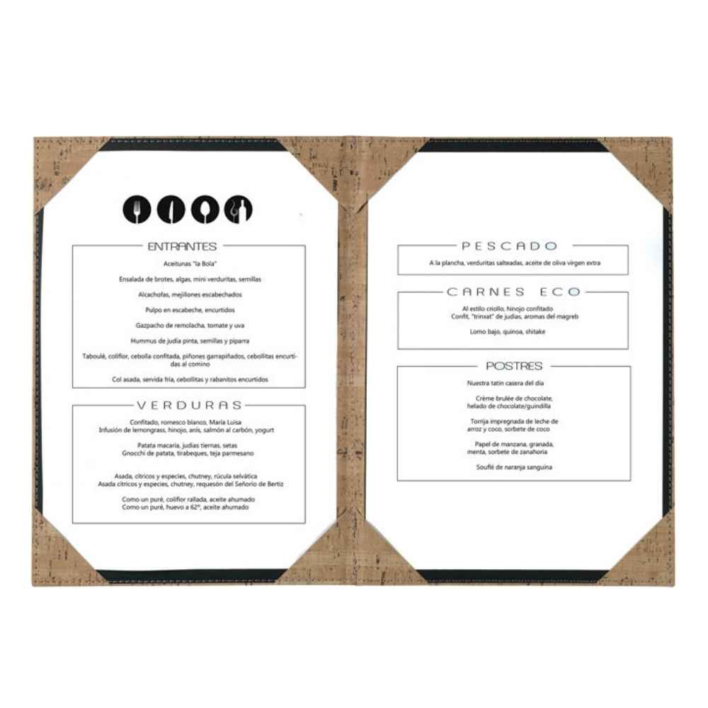 Este portamenú ofrece un sistema sencillo y práctico de 4 solapas interiores para sujetar las hojas, facilitando el cambio rápido de menús o cartas. Su formato A4 de 23 x 32 cm es ideal para menús en tamaño folio, garantizando una presentación limpia y profesional.