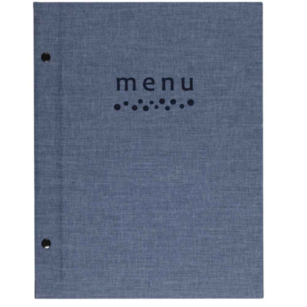 Porta menú A4 Sandro en Teflex azul, resistente a manchas y rayaduras. Incluye 3 fundas interiores y es personalizable. Ideal para hostelería profesional.
