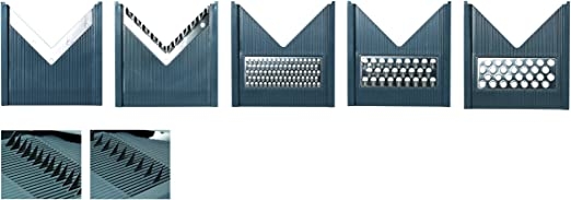 Mandolina robusta de acero inoxidable con 5 cuchillas intercambiables. Ideal para cortes precisos en la cocina profesional.