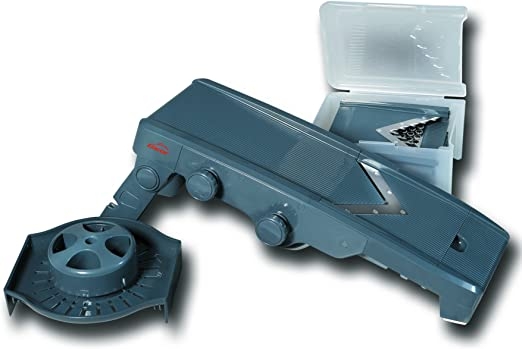 Mandolina robusta con cuchillas intercambiables para cortes precisos. Incluye 5 cuchillas para diversas aplicaciones.