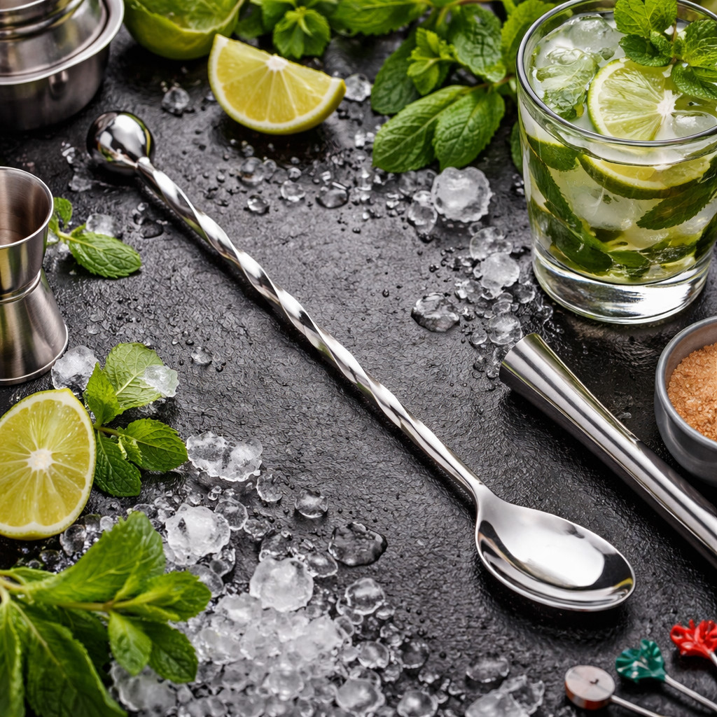 La cuchara batidora rizada de 28 cm es una herramienta esencial en barra para la elaboración de cócteles. Su diseño alargado permite mezclar ingredientes de forma precisa en vasos altos, mezcladores y recipientes de coctelería.