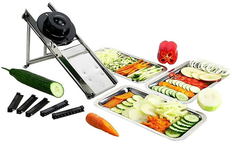 Mandolina robusta de acero inoxidable con 5 cuchillas intercambiables. Ideal para cortes precisos en la cocina profesional.