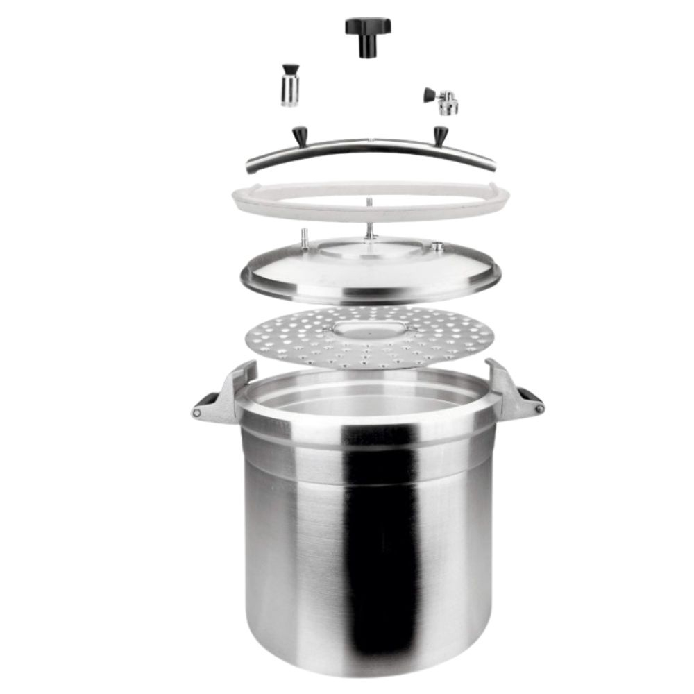 Olla a presión Lacor Robust de 30 L fabricada en aluminio puro 99,55%. Diseñada para uso profesional. Triple seguridad y ahorro energético.