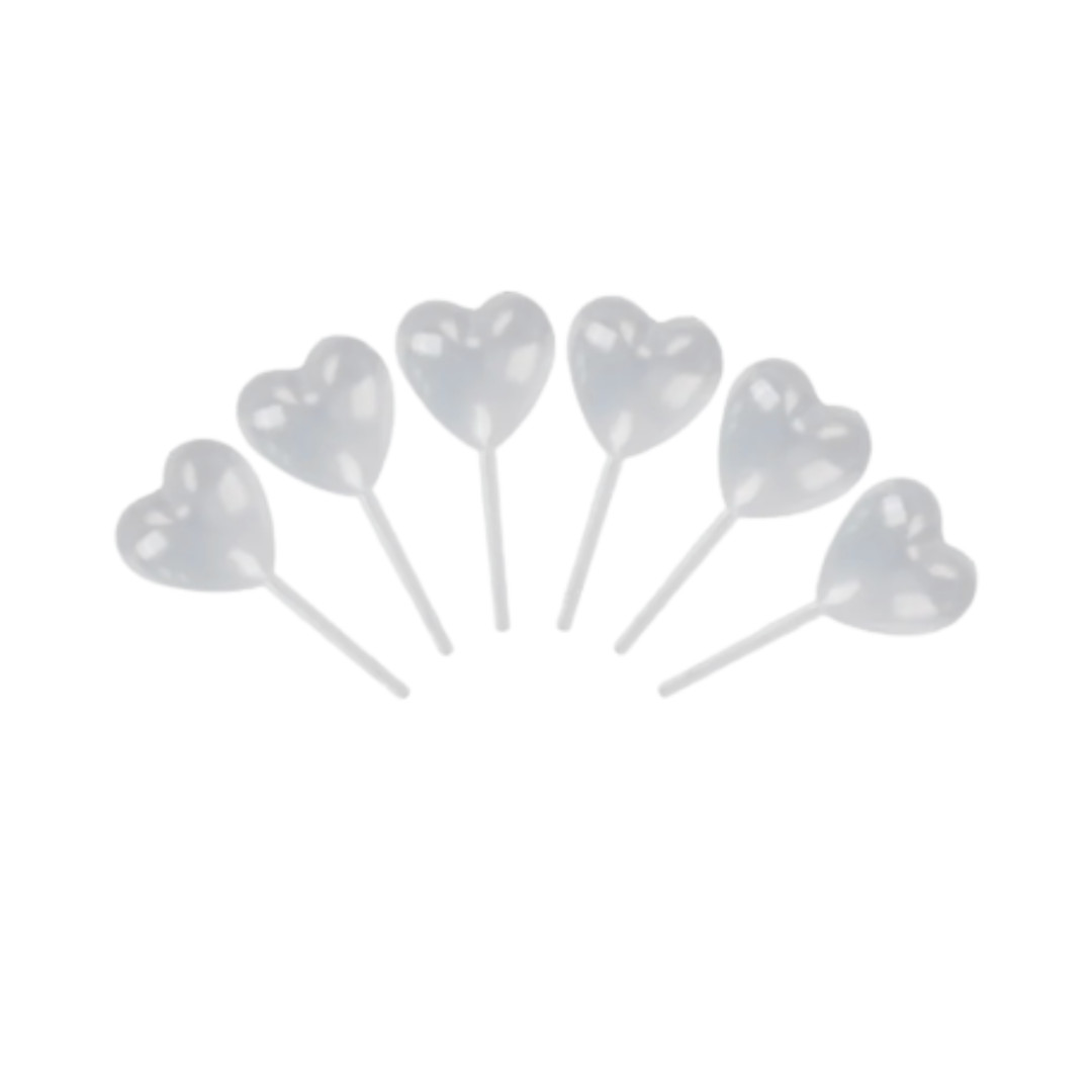 Pipetas de polietileno transparente con forma de corazón para cocina creativa, aperitivos y coctelería. Aptas para alimentos, resistentes a líquidos ácidos y presentaciones técnicas.