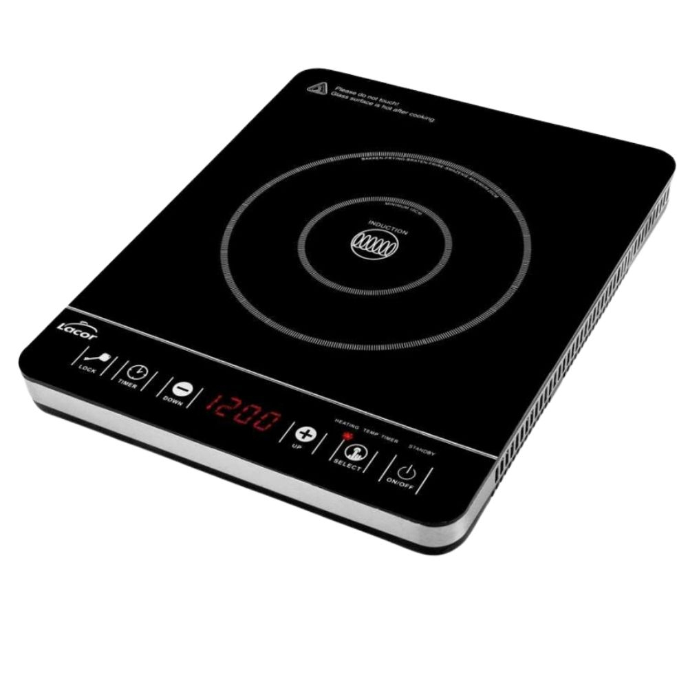 Placa de inducción portátil Lacor 69332 Slim, 2000W, área de cocción Ø 10-20 cm, diseño compacto, control táctil y función de bloqueo.