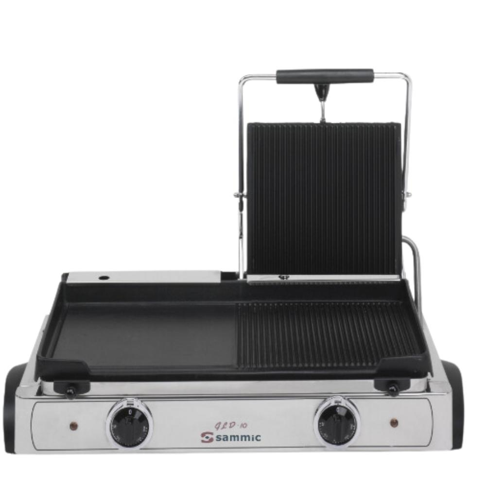Plancha eléctrica GLD-10 mixta doble, 1/2 lisa y 1/2 acanalada, 550x245 mm y 2900 W. Ideal para hostelería profesional.