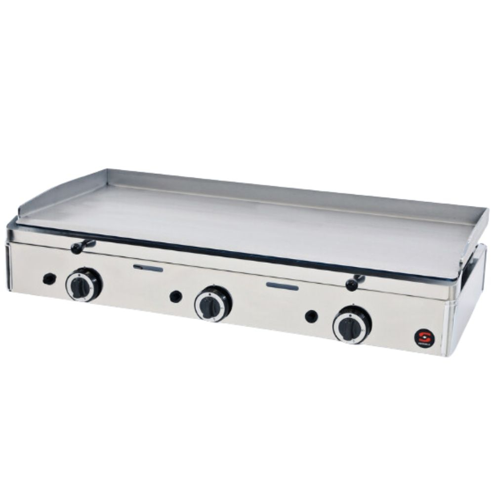 Plancha de gas SPG-1001 con superficie de acero de 983x395 mm, 9300 W y 3 quemadores. Ideal para hostelería profesional.