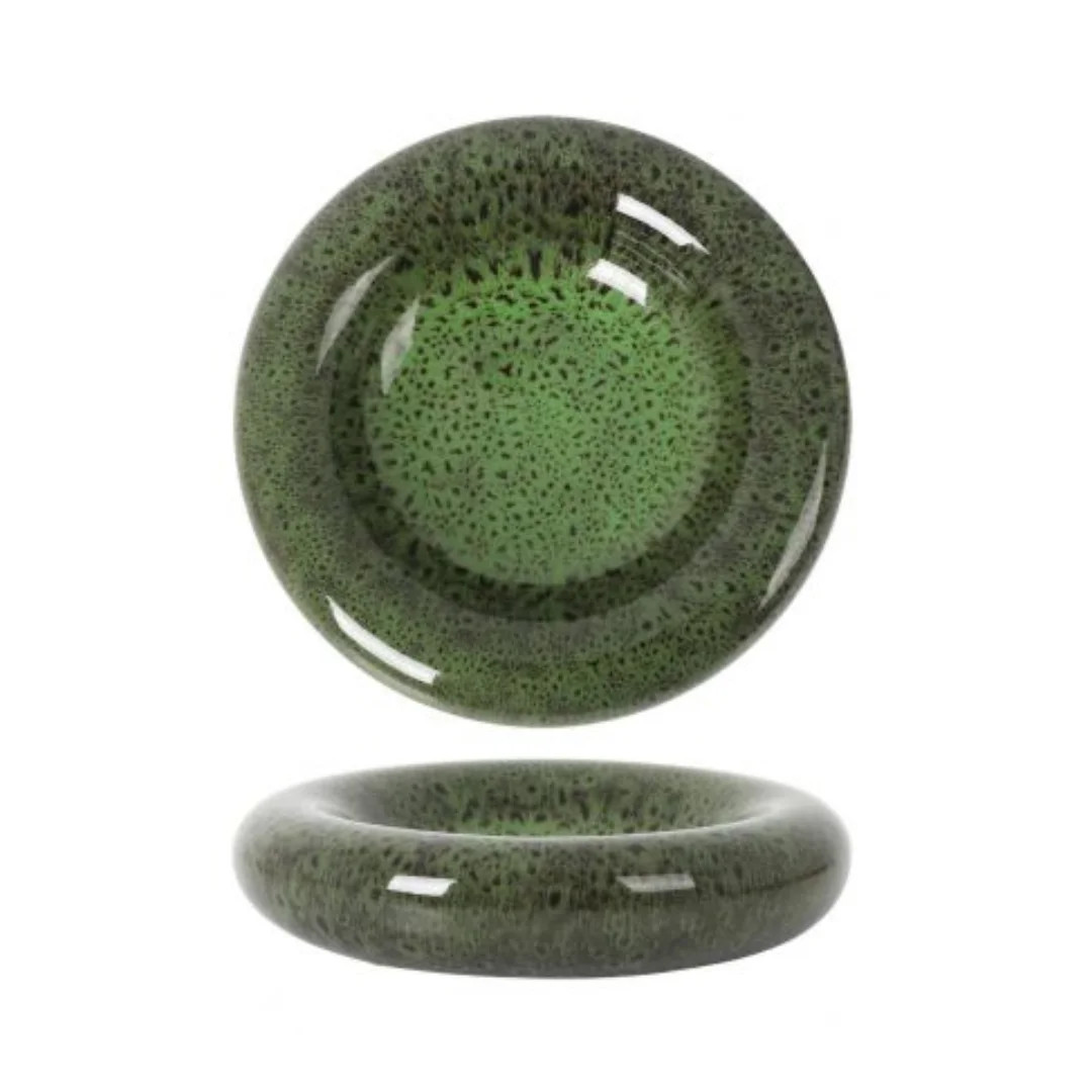 El plato de porcelana verde de la colección Cleopatra está diseñado para aportar impacto visual en la presentación gastronómica dentro de restaurantes, hoteles y servicios de catering. Su acabado moteado en tonos oscuros sobre base verde genera un contraste elegante que realza el emplatado.