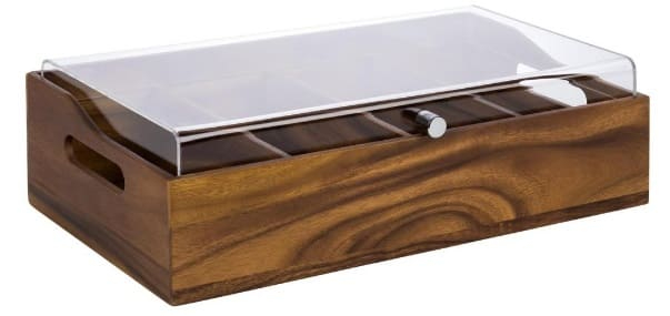Porta cubiertos de madera de acacia natural con tapa de acrílico y 4 compartimentos. Elegancia y funcionalidad para hostelería.