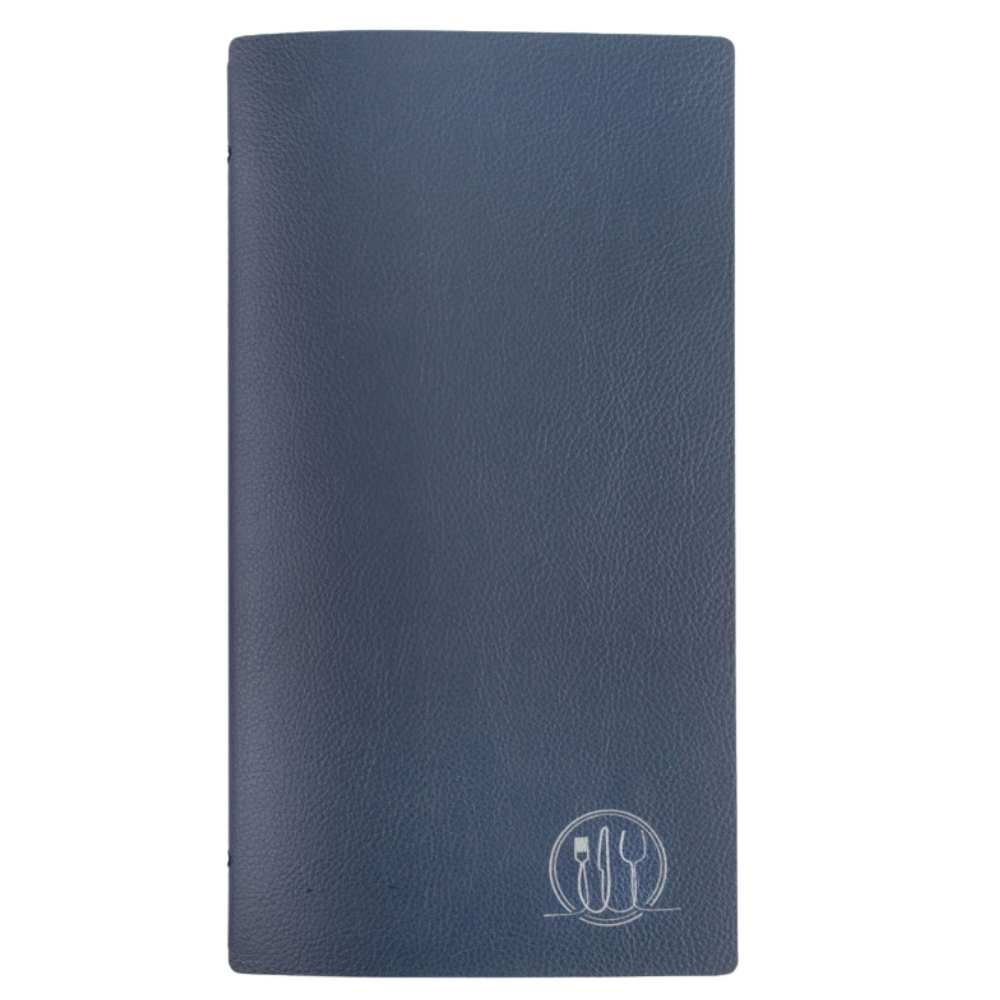 Porta Menú Boscoen formato estrecho vertical, cuero reciclado, artesanal, termosellado gris y remache plata. 4 fundas dobles, 8 caras. Ideal para hostelería.