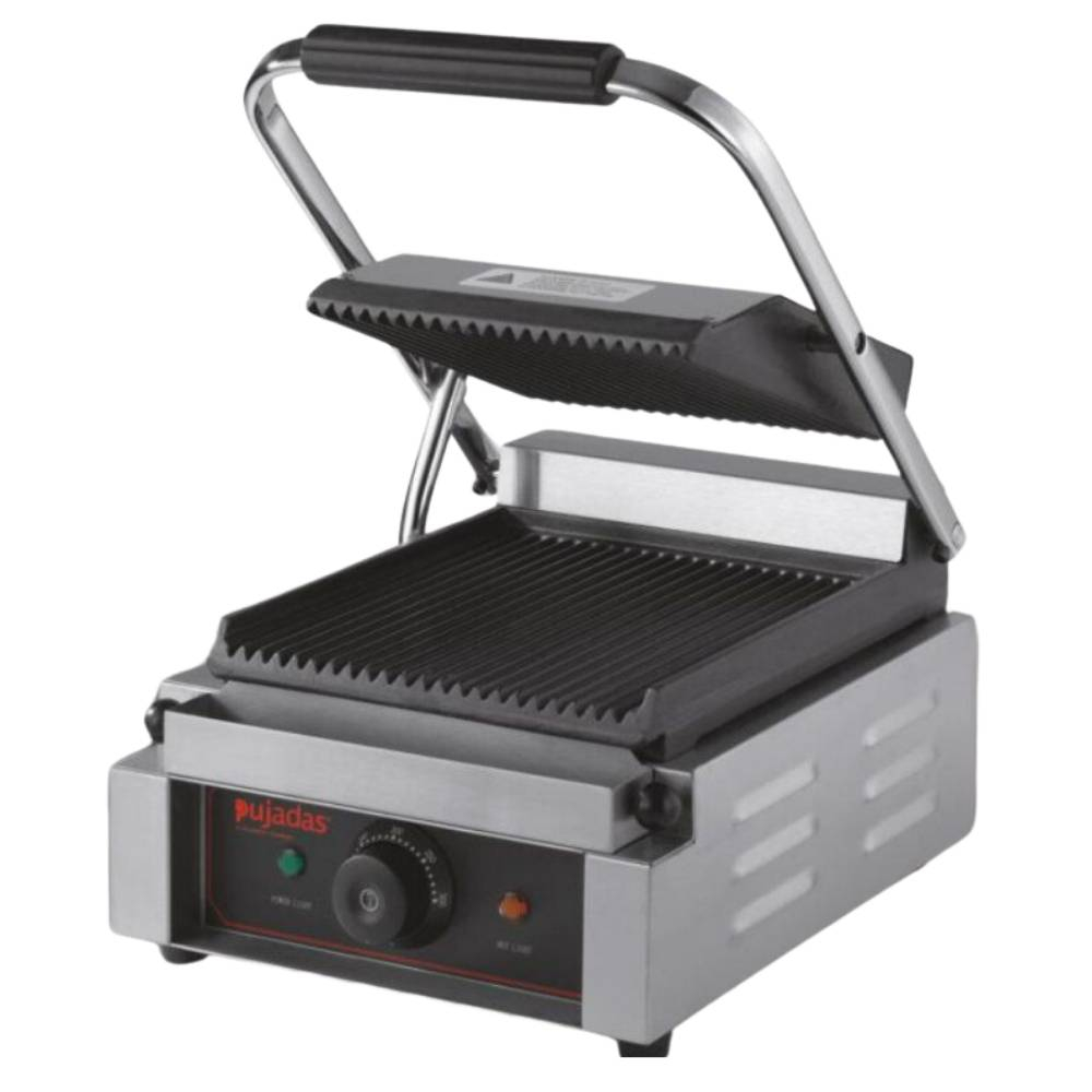 Grill de contacto Pujadas Solo Grande, diseño robusto en acero inoxidable, planchas de fundición, termostato ajustable hasta 300 °C y bandeja recoge jugos.