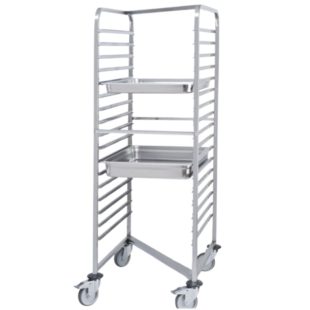 Carro con guías GN 1/1 de 18 niveles, fabricado en acero inoxidable. Capacidad máxima de 150 kg, con diseño robusto y funcional para hostelería profesional.