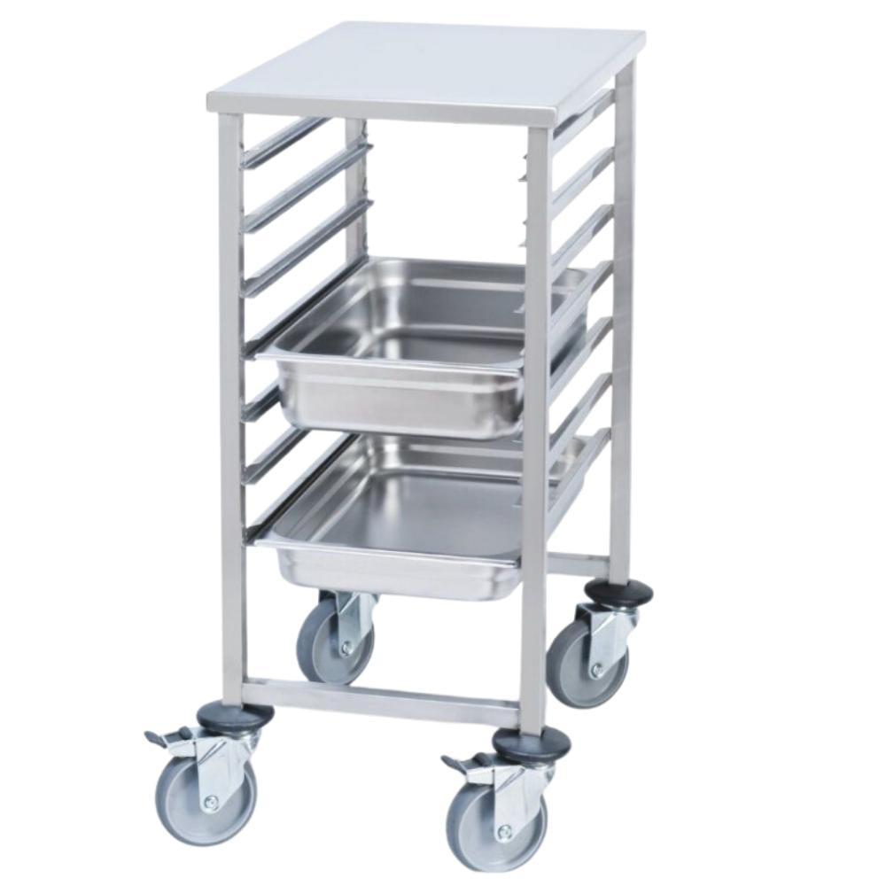 Carro PUJADAS P80540 bajo con 7 guías para GN 1/1. Fabricado en acero inoxidable, ideal para transporte en hostelería y colectividades.
