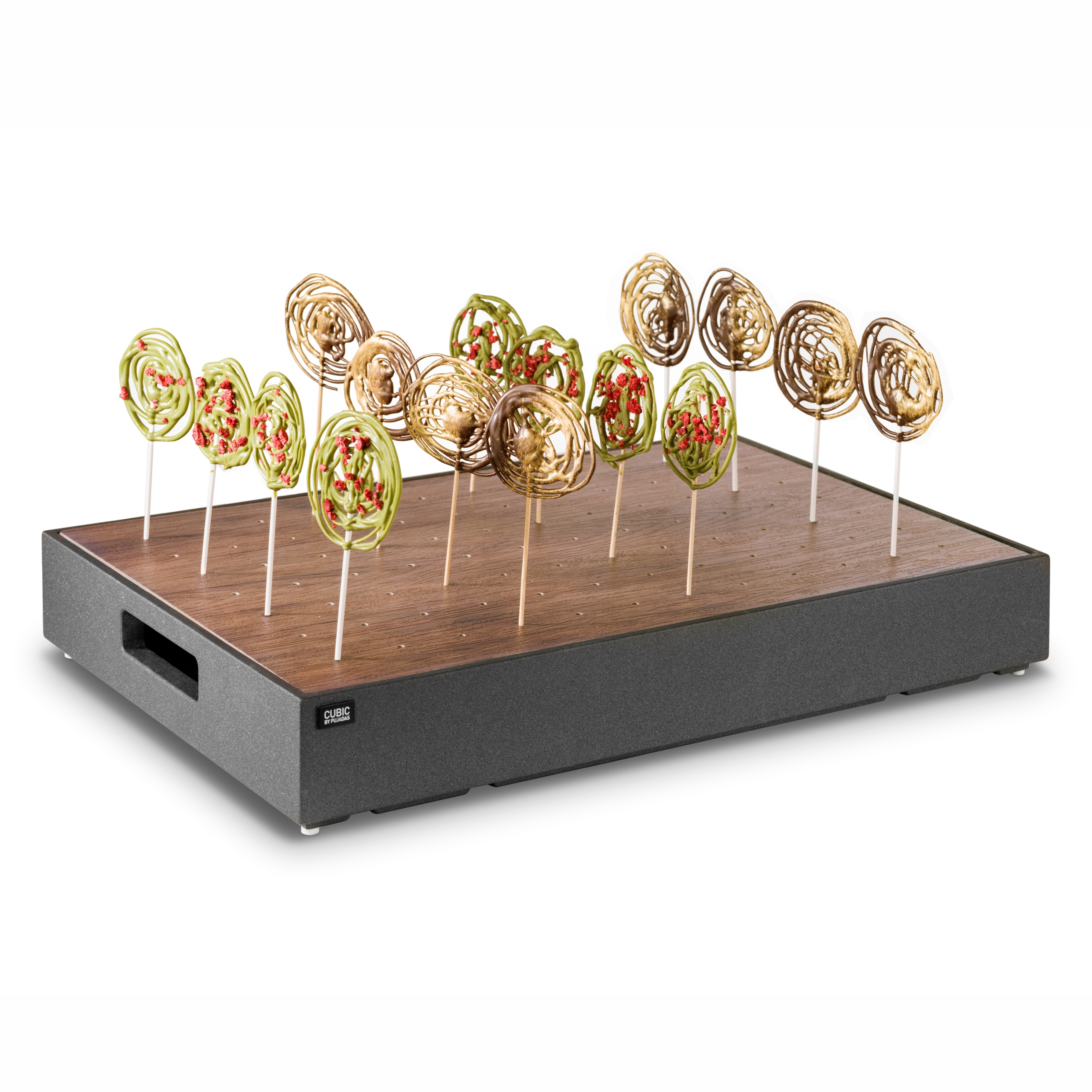 Expositor GN 1/1 para presentación de pinchos Pujadas, con bandejas de madera y melamina y soporte interior de acero inoxidable. Ideal para buffets elegantes y originales.