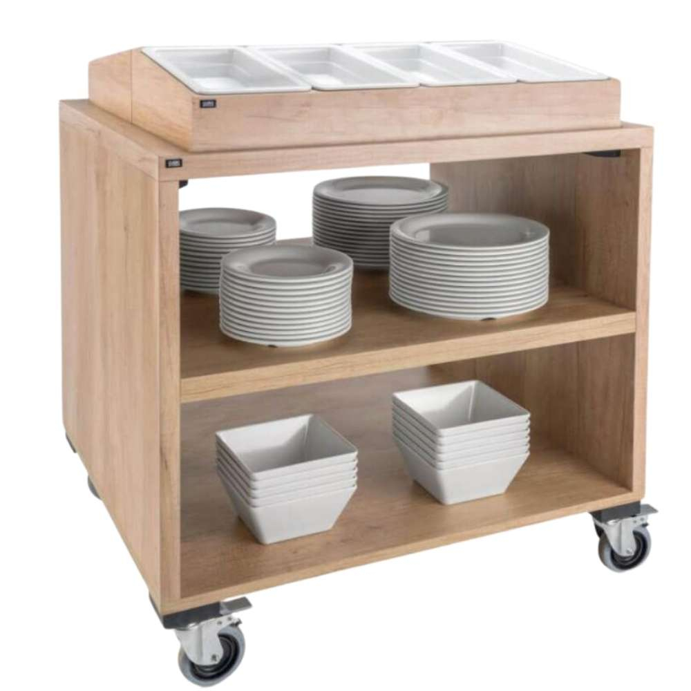 Carro porta-platos y cubiertos en madera, adaptable a diferentes espacios. Diseño robusto y elegante para comedores y buffets profesionales.
