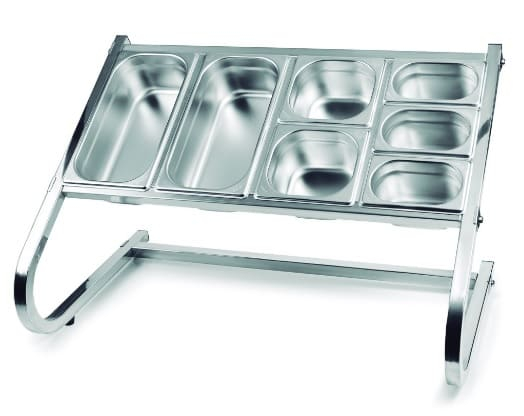 Diseñado para acomodar cubetas gastronorm de hasta 200 mm de profundidad, cuenta con travesaños verticales amovibles que permiten combinar cubetas de distintos tamaños. Sus pies de goma antideslizantes garantizan una estabilidad óptima, incluso durante el uso intensivo. Este soporte no solo organiza los alimentos de manera eficiente, sino que también ahorra tiempo en la preparación de platos.
